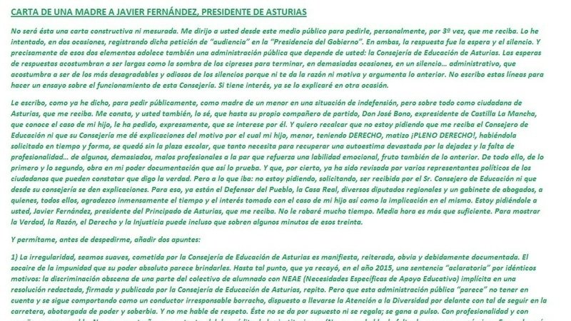 Petition updateOtorguen la plaza escolar a mi hijo Hugo para que pueda seguir estudiandoCARTA DE UNA MADRE A JAVIER FERNÁNDEZ, PRESIDENTE DE ASTURIAS
