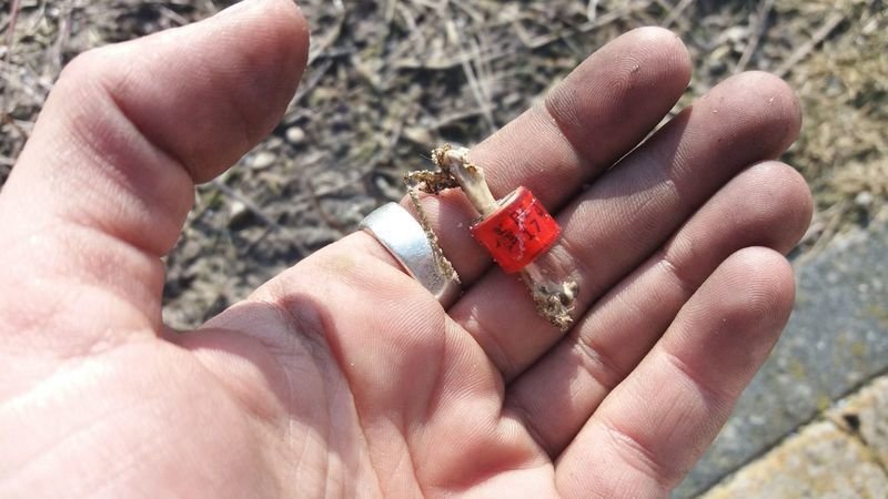 Paseando, nos hemos topado con este anilla con su huesecillo asociado. Es de una paloma de carreras del año 2017.