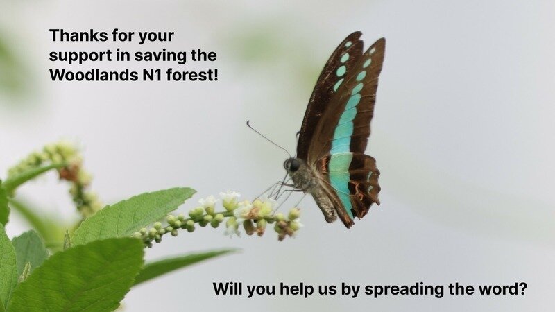 We at the Woodlands Botanical Garden have been voicing our concerns about the Woodlands N1 forest on several fronts - most importantly, through an email directly to the President of Singapore, laying out our case. When we get a reply, we will make sure to update everybody.