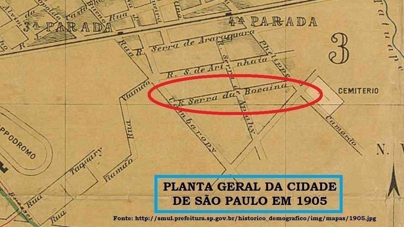 Na Planta Geral da Cidade de São Paulo em 1905 a Rua Serra da Bocaina já figurava com a exata extensão que tem hoje. Note que inicia na Rua Cambaropy (atual Siqueira Bueno) e termina na Rua Phelippe Camarão (atual Av. Álvaro Ramos). Se Serra da Bocaina chegou até nossos dias, não deveria ser respeitado e preservado?