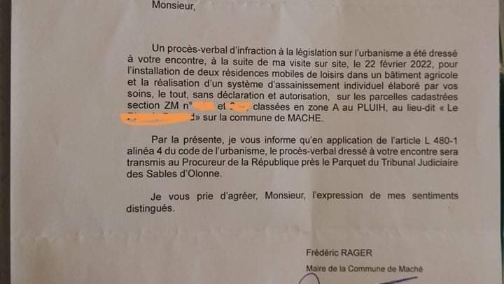 Le proces verbal d'infraction au code de l'urbanisme a été envoyé au procureur, voici la lettre reçue cette semaine.