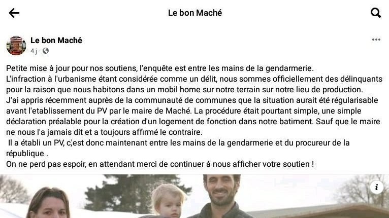 J'ai appris récemment auprès de la communauté de communes que la situation aurait été régularisable avant l'etablissement du PV par le maire de Maché. La procédure était pourtant simple, une simple déclaration préalable pour la création d'un logement de fonction dans notre batiment. Sauf que le maire ne nous l'a jamais dit et a toujours affirmé le contraire.