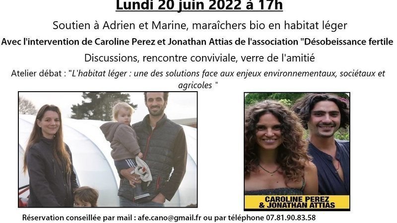 Bonjour à tous, on organise une rencontre avec l'association Désobéissance fertile sur le thème de l'habitat léger, ce sera l'occasion pour nous de rencontrer les soutiens de notre pétition et de partager un verre.