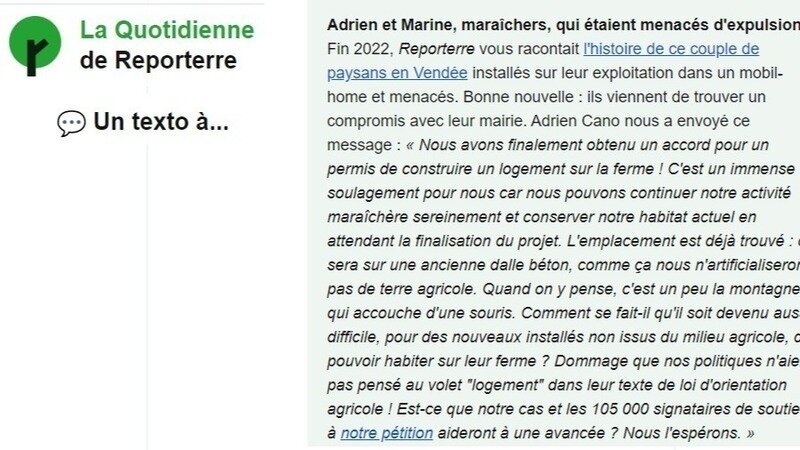 Konbini qui republie sur instagram un peu maladroitement le reportage tourné il y a plus d'un an et qui n'est plus à jour ( https://www.instagram.com/p/C5nEIazNq_V/?hl=fr ) ... Ca devrait être rectifié, et pourquoi pas faire un nouveau reportage ? Une avancée juridique pour l'habitat paysan, c'est une nouvelle à partager ! �♂️