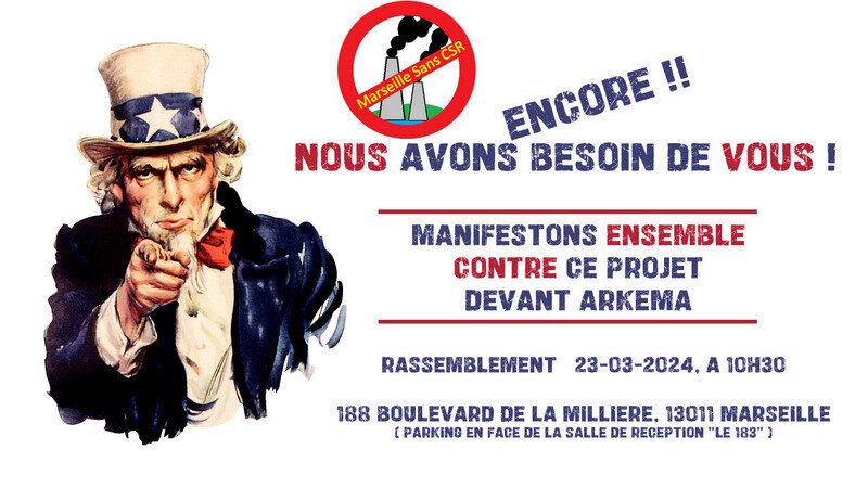L'association Marseille sans CSR vous invite à venir manifester votre opposition à ce projet de chaufferie CSR le samedi 23 Mars 2024, à 10h30 !