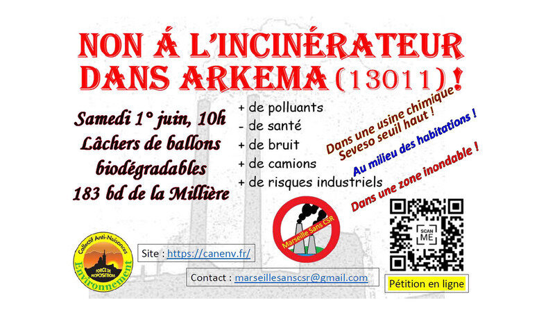 Rassemblement sur l’aire de retournement des bus, en face du 183 Bd de la Millière – ARKEMA, avec banderole et pancartes. Le lâcher des ballons aura lieu en fonction du vent dominant.