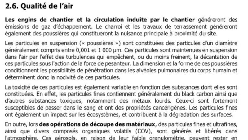 « La toxicité de ces particules est également variable en fonction des substances dont elles sont constituées. En effet, les particules fines contiennent généralement du black carbon ainsi que d’autres substances toxiques, notamment des métaux lourds. Ceux-ci sont fortement susceptibles de passer dans le sang et ont des propriétés cancérigènes. Les particules fines ont également un impact sur les écosystèmes, et contribuent à la dégradation des surfaces » (p.3 du rapport d’incidences chantier).