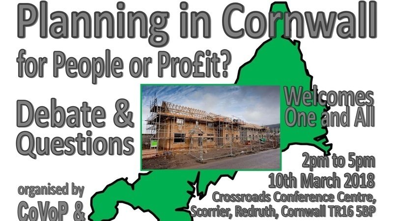 A discussion about Planning issues in Cornwall and across the UK, for anyone who wants to make a difference. We want to ensure that no region is alone in the battle against incompetent Planning and that we make our case strongly at both Local and National level. Guest speakers will include the Chair of CPRE, South Hams and the Chair of Community Voice on Planning (CoVoP)