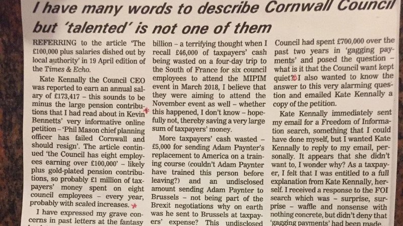 Our first item of interest today is “Who earns what on Cornwall Council’s fourth floor”. The following eye watering salaries now being paid by the council in 2017/18 have revealed that the council’s new head of legal, Melanie O’Sullivan now earns nearly double of what her predecessor was paid. Ms O’Sullivan’s, who was initially engaged as an interim, received a salary £162,953 as the second highest member of staff. A survey of other local government’s head of legal officers are in the £50,000 to £95,000 range. Cornwall Council’s chief executive earned £173,417 and had an annual contribution to her pension of £30,348. (The British Prime Minister earns just over £150,000). Three Strategic Directors including Mr Masters, earned more than £142,000 and got pension contributions of over £20,000. Another senior executive received £133,276 and another received £101,402.