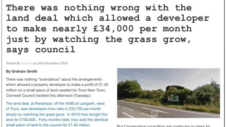 The land deal, at Penstraze, off the A390 at Langarth, west of Truro, saw developers Inox rake in £33,750 per month simply by watching the grass grow. In 2016 Inox bought the land for £100,000. Forty months later, Inox sold the identical small patch of land to the council for £1.45 million.