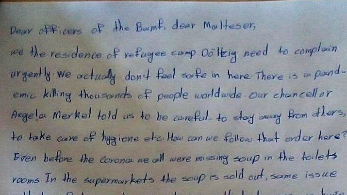 Mohsen stammt aus dem Iran, ist Lehrer und seit 8 Monaten im Camp in Dölzig. Gemeinsam mit 70 anderen Refugees schrieb er einen Brief, nachdem niemand ihre Klagen über die unhaltbaren hygienischen Zustände hören, niemand ihre Fragen beantworten und ihre Ängste vor Ansteckung ernst nehmen wollte: „Wir werden behandelt wie Hunde, oder wie Kinder, die man nicht ernst nimmt; man belügt uns immer wieder oder sagt, man könne auch nichts tun; nach außen werden die Zustände schön gefärbt. 35 €/Woche müssen reichen für Seife, Desinfektion, Kleider, ggf. Zigaretten oder was zu essen, was einem schmeckt – allein die Busfahrt nach Leipzig zur Volkshochschule (Deutsch lernen) kostet aber pro Woche schon 35 €,“ berichtet er dem Freundeskreis.