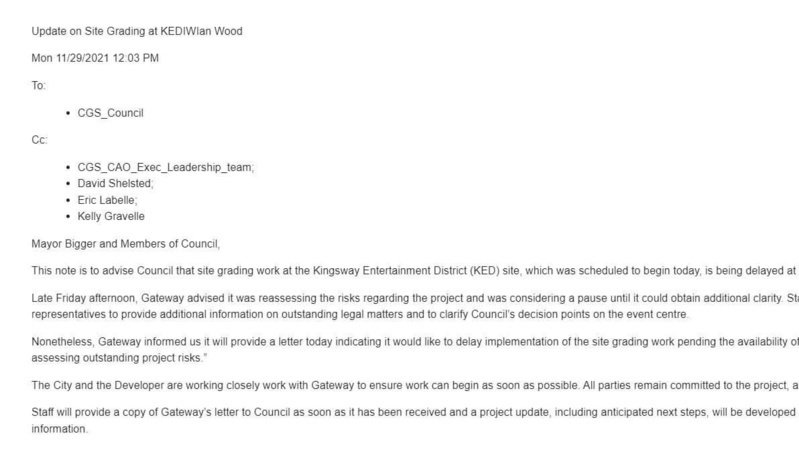 Gateway indicates that they are waiting for answers to project risk assessment issues that the city has not provided – probably many of the same concerns expressed by councilors earlier this year that were never honoured with a respectful reply… or any reply.
