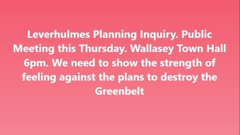 The Planning Inspector has called a public meeting at Wallasey Town Hall on Thursday 8th June at 6pm. WE NEED A SHOW OF SUPPORT AND UNITY AGAINST THESE PLANS TO DESTROY OUR PRECIOUS GREEN BELT.