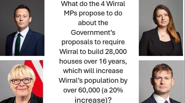 An Open Letter, emailed today, to the 4 Wirral MP’s, from the Wirral Green Space Alliance, regarding the Government’s Proposals to require the Wirral to build 28000 houses increasing the population by 20% (60,000)