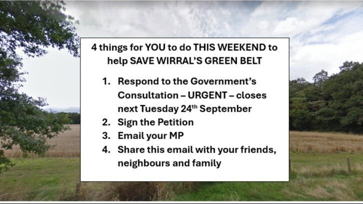 (PLEASE SHARE) Wirral Green Space Alliance has been working tirelessly to help save Wirral’s Green Belt. We need YOU to do your bit and spend some time this weekend doing the following 4 things.