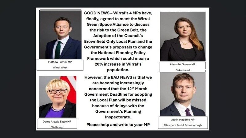 The GOOD NEWS is that, after many months of trying, the Wirral Green Space Alliance (WGSA) will finally be meeting the Wirral MPs this Friday, 28th February.