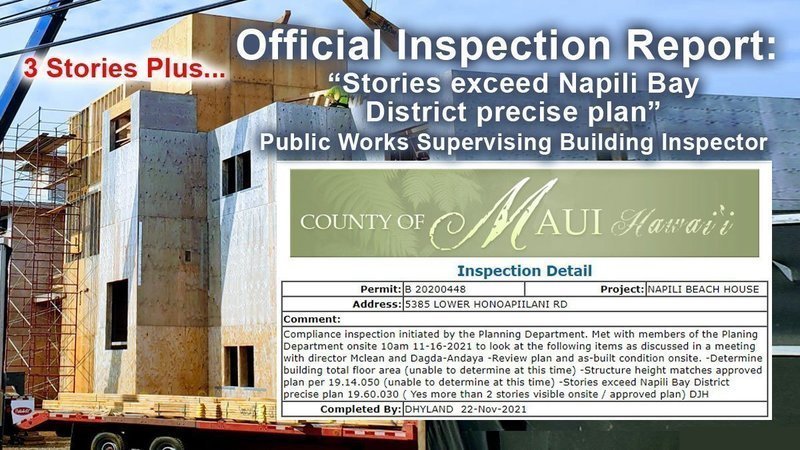 Last Wednesday Jordan Molina, Deputy Director of Public Works, publicly acknowledged that Public Works was processing a Stop-Work Order that was expected to be issued to Greg Brown's Napili Bay construction by last Friday, citing that Mr. Brown's Three-Story-Plus structure violates the Napili Bay District Two -Story limit, as documented in an official inspection report posted in the County's Kiva system on Monday 11/22/2021.