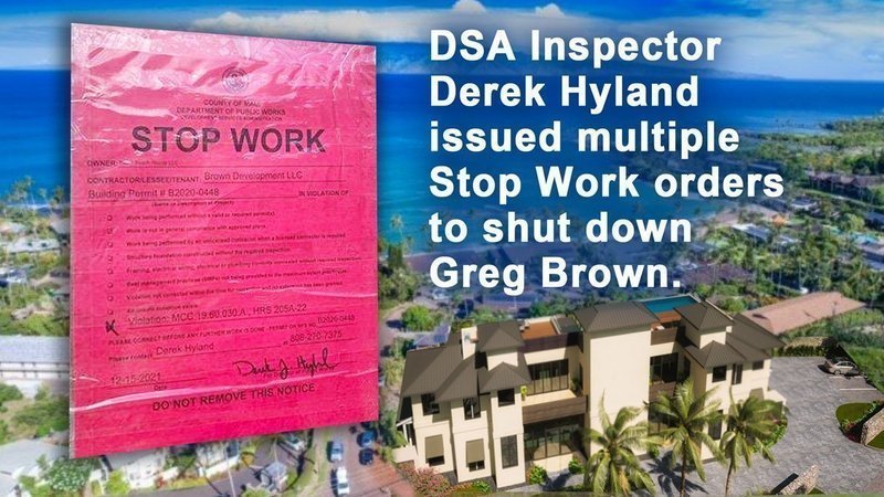 Eight months after Chris Salem first notified Mayor Victorino of Greg Brown's violations and six months after Mr. Salem was terminated as retribution for responding to community complaints and pressing the matter within the administration, Greg Brown has finally been ordered to stop all work on his Napili Bay “Hotel”.