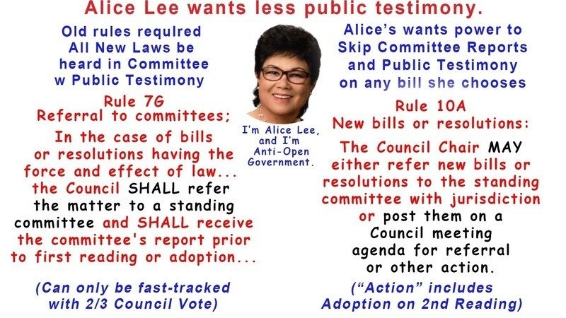Alice Lee wants to restrict your opportunity to provide Public Testimony on any Council issue she chooses.