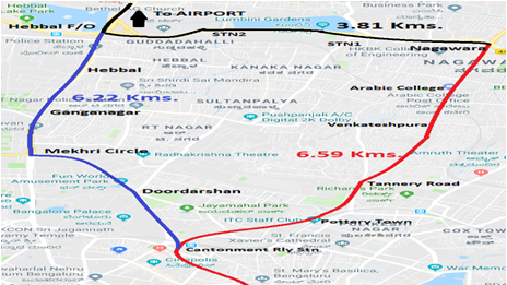 To solve many challenges faced by this line, I suggest change in alignment of R6 - From Shivajinagar Bus Stand, retain the alignment as in Version 1 to Cantonment Railway Station. From here, take it elevated to Mekhri Circle and from there to Hebbal Flyover.