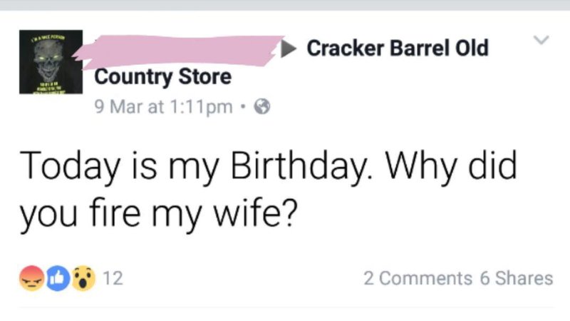 After 11 years of dedicated service, long shifts and weeks full of overtime, a Cracker Barrel location, assumed to be at 2393 Pacer Court Northwest, Corydon, IN 47112, fired Brad's wife and refuses to provide a clear and reasonable explanation as to why. We, the people of the world, demand an answer and #JusticeForBradsWife.