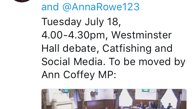 Ann Coffey MP is talking in parliament about 'Catfishing'. It's been something she feels strongly about for a while and we've been in contact. Tuesday the 18th 4-4:30 pm ☺️