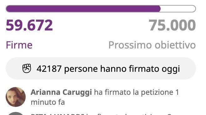 Sembrava impossibile, dopo un avvio incerto che mi aveva scoraggiato perché nel primo girono eravamo ancora lontani addirittura dalle 1000 firme ma poi l’impegno di tutti ha fatto il miracolo e le firme sono cominciate ad arrivare con una velocità impressionante, soltanto ieri più di 42.000 e non si sono fermate neanche stanotte, stamattina erano 5000 in più di ieri, arrivate forse da altri fusi orari.