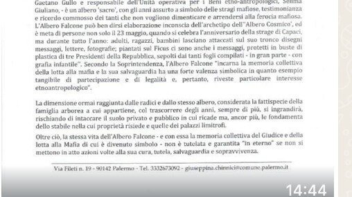 In realtà il merito dia questo primo passo va a Giuseppina Chinnici che a seguito della petizione, aveva presentato presso l’VIII Circoscrizione, di cui è Consigliera, una mozione che aveva già fatto partire la procedura, da parte della Soprintendenza per la tutela dell’Albero di Via D’Amelio come bene vincolato e è a lei soprattutto che va il mio ringraziamento, per avere operato in silenzio e non per ricavarne dei meriti di qualsiasi tipo.