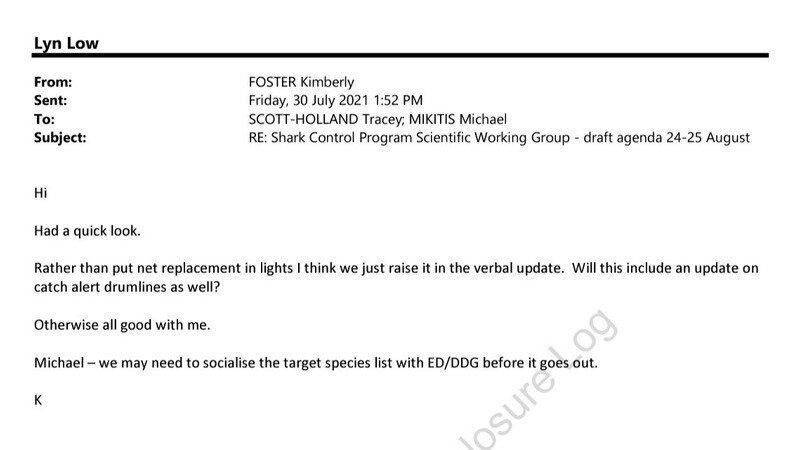 We obtained an internal Fisheries (Queensland Shark Control Program) email from 2021 via RTI, where they are discussing the abandoned trial to replace shark nets with drumlines during whale migration season in QLD, which would reduce whale entanglements.