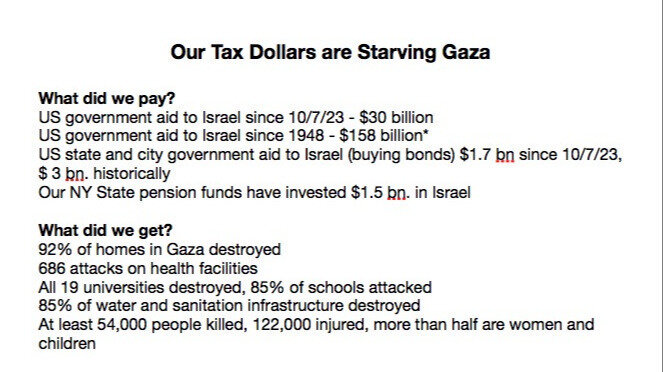 We are entering Week 95 of Israel's attacks on Gaza, with 59,000 identified as dead from Israeli attacks (only a portion of the toll because many still lie buried and unidentified beneath the rubble and many have died from malnutrition and disease directly resulting from Israel's unending siege, You may wonder whether our phone calls, demonstrations, and letter writing have made a difference. I promise you they have. We have not stopped the slaughter but we have forever changed Americans' belief that Israel is a liberal democracy deserving our unstinting support. It was only by educating ourselves and millions of others about the Israeli project to displace and erase Palestinians and steal the rest of their land.