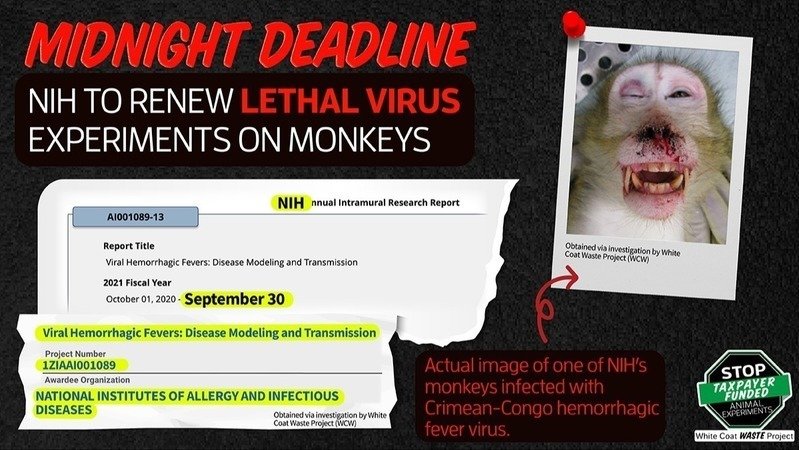At MIDNIGHT tonight, NIH white coats under DR. ANTHONY FAUCI may ram through a NEW ROUND of tax money for lethal hemorrhagic virus experiments on monkeys. Please help!