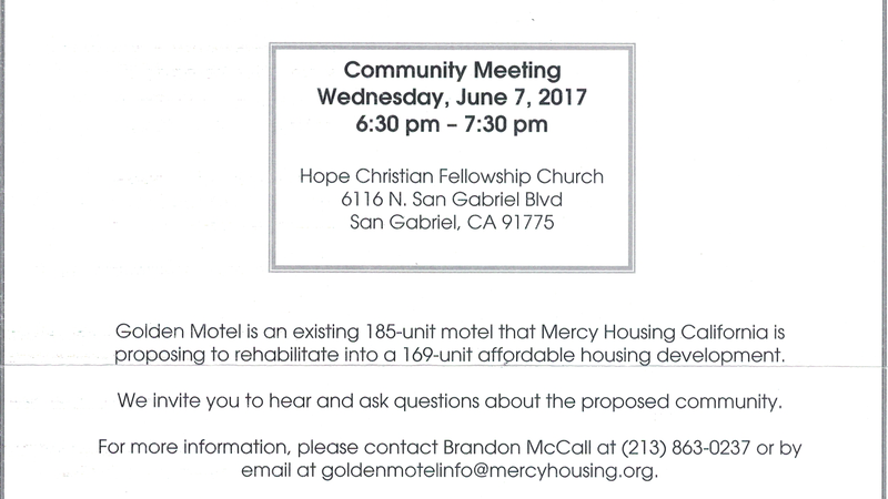 Mercy Housing California invites you to a neighborhood meeting to learn about the proposed affordable housing community at the Golden Motel on Wednesday, June 7th, from 6:30 pm -7:30 pm.