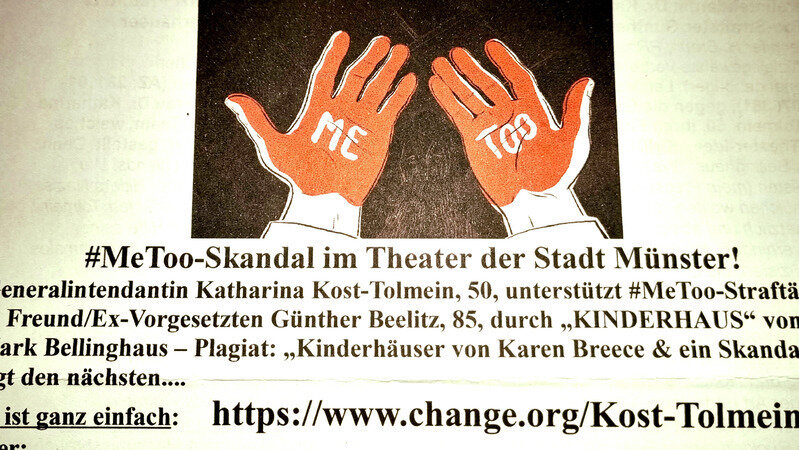 Es muss endlich etwas grundlegendes passieren, denn unsere Kinder sind schon lange nicht mehr sicher in diesem Land. Im Namen der 45 Ex-Theaterangestellten, die von einer Machtmissbrauchenden Generalintendantin von Münster "Kahlschlag" (O-Ton Antenne Münster) beging, und dann kurz danach ihren eigenen Ehemann als Moderatoren eine Arbeit gab (die "Trauzeugenaffäre" zwischen Vizekanzler Robert Habeck und Patrick Graichen läßt hier schön und herzlich grüßen), dann sollte man doch meinen, dass die aktive Unterstützung dieser überführten und geschnappten Theaterleiterin sie ihren Job kosten müsse. Ja, das ist nun auch in Sicht.