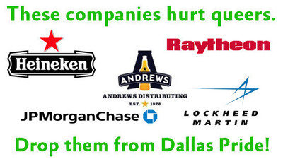 The corporations financing the Dallas Tavern Guild parade support anti-gay politics, kill innocent civilians, exploit the poor, and deny transgender employment protections. A community-funded, corporate-free Pride would better reflect of our community's shared social values of justice and equality for queers everywhere.