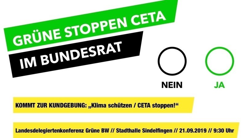 21.9.: Nur ein Tag später heißt es "Klima retten / CETA stoppen!". An diesem Tag findet nämlich die Landesdelegiertenkonferenz der Grünen von Baden-Württemberg statt. Nachdem wir leider keine kurze Rede auf der Konferenz halten dürfen und auch keine Rückmeldung auf unsere Anfrage bekommen haben, ob wir unseren offenen Brief (ceta-im-bundesrat.de) Herrn Kretschmann und dem Bundesvorstand übergeben dürfen, werden wir nun lautstark klar machen: Wer sich Klimaschutz auf die Fahne schreibt, darf CETA nicht zustimmen! Wer jahrelang gegen CETA kämpft und damit Wähler*innenstimmen gewinnt, darf CETA nicht zustimmen!