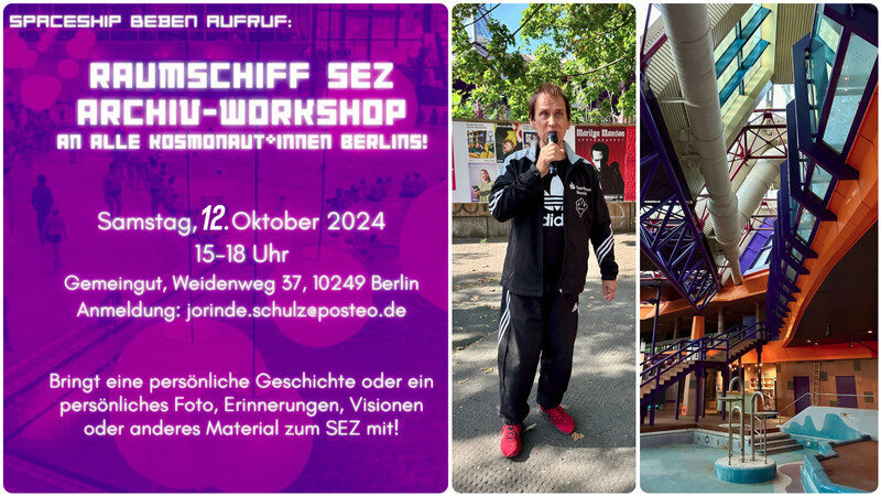 am Wochenende sind Erinnerungen ans SEZ und/oder Kreativität gefragt. Gemeingut in BürgerInnenhand veranstaltet einen Raumschiff SEZ Archiv-Workshop mit dem feministischen Science-Fiction-Künstler*innenkollektiv Spaceship Beben. Gemeinsam soll ein kreatives Archiv der Erinnerungen und Geschichten rund ums SEZ aufgebaut werden.