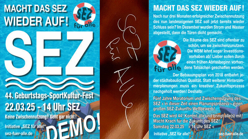 am 20. März jährt sich die Eröffnung des einzigartigen SEZ zum 44. Mal. Das nehmen wir zum Anlass, das SEZ zu feiern und eine Wiedereröffnung sowie erneute Zwischennutzungen zu fordern.