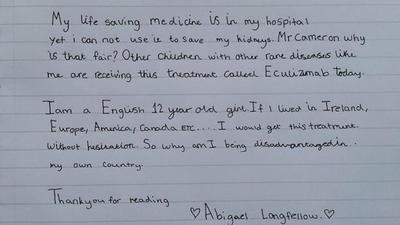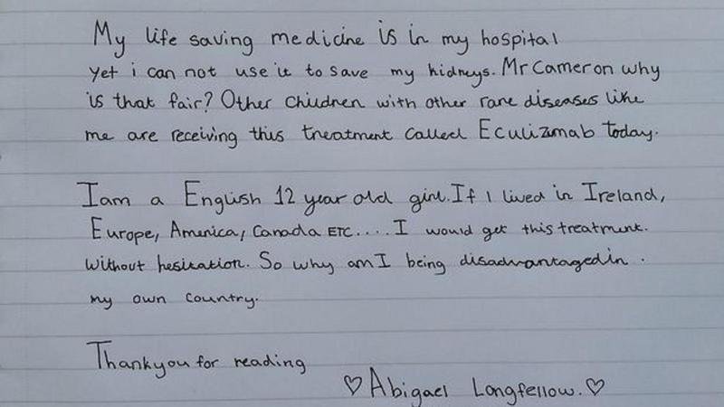 This is a life/death matter!! We should all try to save the life of this little girl, Abigail Longfellow, and anyone who is on the same situation! I am sure there are a lot of other people in the same or similar situation as her! Let's please get her the help she so much needs before is too late!! If we do this now, we will also stop this from happening to other people who has also been denied of such much needed help! The government must comply with all human rights and not act against them!! This is a life, not a trip to the supermarket, Mr Cameron!!!
