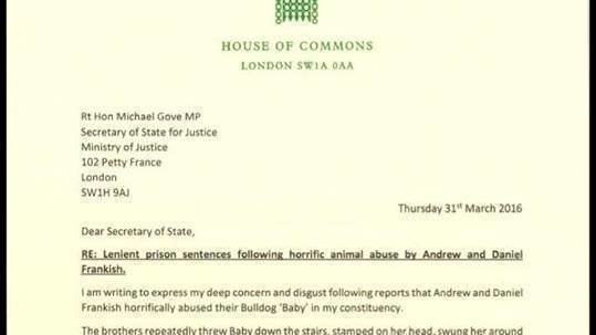 Okay, now I've got that out of the way, let's talk about progression. Anna Turley, the MP for Redcar, has gotten behind the petition in a big way. She has sent a letter to the Justice Secretary Michael Gove, calling for the Frankish brothers' sentences to be reconsidered and to have tougher laws imposed on animal cruelty cases. I have attached a screenshot of the letter, from Anna's Twitter account, to this update for you all to see. This means we're a million times closer to getting something done about all of this, and you have yourselves to thank for that - without you all helping this topic become too hot to handle, it wouldn't have been noticed in the same way. You're all making this possible.
