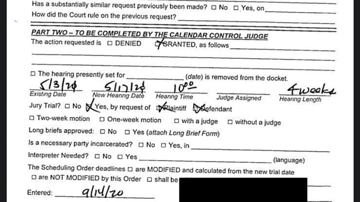 Originally, the Defamation trial date was continued to May 3rd, but it now looks like the trial is set instead for May 17th at 10am. And, according to this report, the trial is set to take 4 weeks.