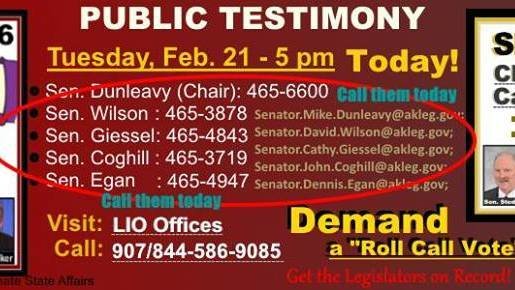 PUBLIC HEARING TODAY: Please visit the LIO today, call, email on these bills to change the Fund and cut the PFD to pay for government. STOP Senate bills 21 and 26 and taking the People's money without our consent. Tell them to restructure government not the PFD! Go to www.akleg.gov and search for these bills for more detail. EMAIL for the record at: Senate.State.Affairs@akleg.gov CALL Legislators listed below and CALL the hearing at 5pm (toll-free) at 844-586-9085