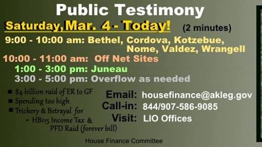 Here's a list of PUBLIC HEARINGS on the schedule in Juneau (Mar. 4-10) Right now, Sat, 3/4 contact house.finance@akleg.gov on the budget plan (info below for HB57 also called SB22). You don't need to be an expert on the budget to tell them - "Hand's off the People's money in the Fund without our consent!" That's the bottom line. On top of that, go ahead and propose whatever you think are other options - they already know there are other options! RESIST THE RAID!!