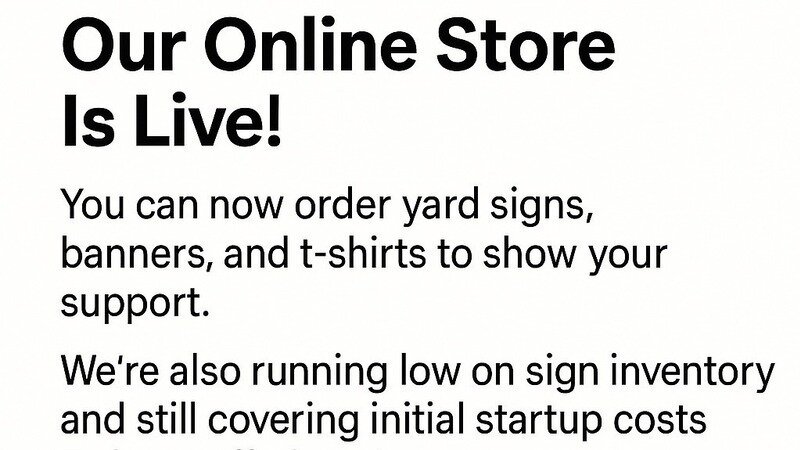 We’ve officially moved into a new phase—our online store is now live! You can now purchase yard signs, banners, and t-shirts directly from the site. If there’s a specific item you’d like that isn’t listed, feel free to reach out—we’re happy to add it for you.
