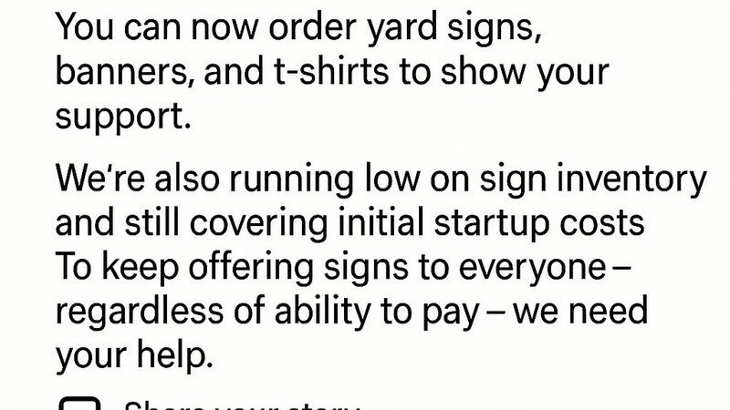 Additionally, we’re running low on our original supply of yard signs—the very ones that helped us gain visibility and momentum. To continue offering these signs to the public and maintain our outreach efforts, we urgently need donations.