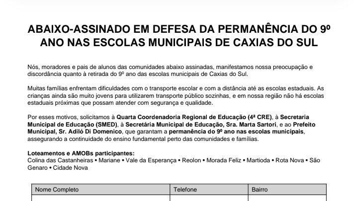 Assine esta petição para mostrar seu apoio e lutar pela garantia de uma educação de qualidade e inclusiva para todas as crianças de Caxias do Sul. Vamos juntos impedir essa mudança que pode causar prejuízos irreparáveis para o desenvolvimento dos nossos jovens. Sua assinatura pode fazer a diferença na construção de um futuro melhor para nossa sociedade.