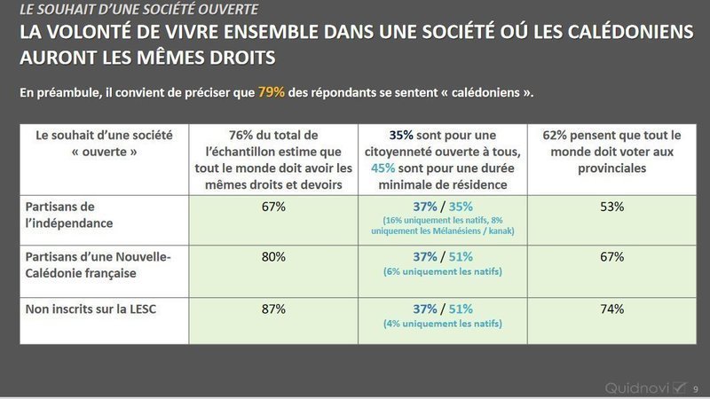Selon ce tableau issu de la synthèse d'écoute profonde de l'institut Quidnovi, on constate que 53 % des partisans de l'indépendance sont favorables à ce que TOUT LE MONDE puisse voter aux élections provinciales, 67 % pour les partisans d'une NC française et 74 % des exclus de la LESC.