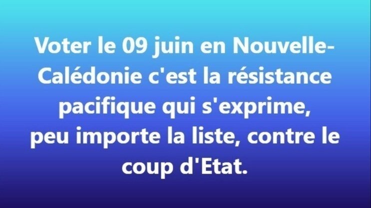 En participant le 09 juin aux élections européennes, vous manifesterez votre résistance au coup d'Etat en cours en Nouvelle-Calédonie. Si l'Etat a maintenu ces élections ici, nous devons aller voter, ce sera un symbole fort envoyé à l'Etat pour qu'il ne nous abandonne pas, et ce quelle que soit la liste de candidats pour qui vous voterez. C'est une participation plus importante qu'habituellement des citoyens qui sera perçue comme un message clair par l'Etat.