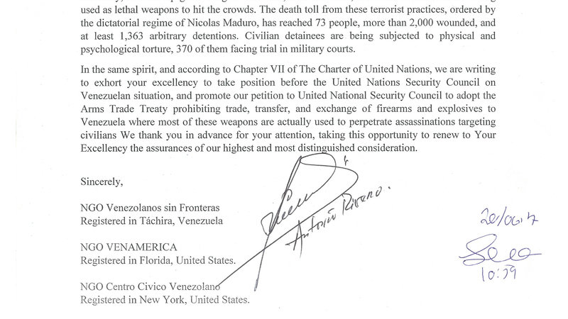 In the same spirit, and according to Chapter VII of The Charter of United Nations, we are writing to exhort your excellency to take position before the United Nations Security Council on Venezuelan situation, and promote our petition to United National Security Council to adopt the Arms Trade Treaty prohibiting trade, transfer, and exchange of firearms and explosives to Venezuela where most of these weapons are actually used to perpetrate assassinations targeting civilians We thank you in advance for your attention, taking this opportunity to renew to Your Excellency the assurances of our highest and most distinguished consideration.