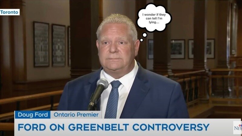 If there was any doubt that Doug Ford should immediately resign, AND a criminal investigation be started this interview should resolve it. In a press conference this morning, this pathetic excuse for a leader did everything but accept accountability for the corrupt (and perhaps illegal) sale of prime greenbelt lands to preferred developers (read cronies).