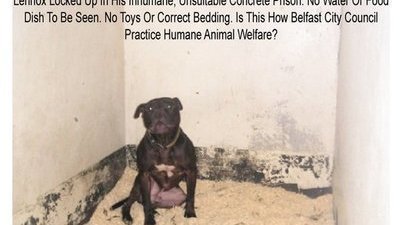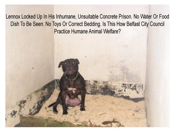 Lennox on Death Row - Photographs of Lennox have emerged recently and have been passed to the family which clearly show Lennox in a cold inhumane concrete kennel which is visibly too small, there are no visible signs of a constant fresh water supply, heating, toys for stimulation and the photographs show Lennox sitting upright in a box type bed surrounded by his own faeces with only saw dust for bedding which many dog experts have agreed is harmful to dogs and unsuitable for bedding, yet Belfast City Council Dog Wardens Department have stated they practice humane animal welfare as set out by the DARD (Department of Agriculture and Rural Development). After studying the Animal Welfare Act 2006 it is clear that none of Lennox’s welfare needs are being met at this undisclosed Council contracted kennel